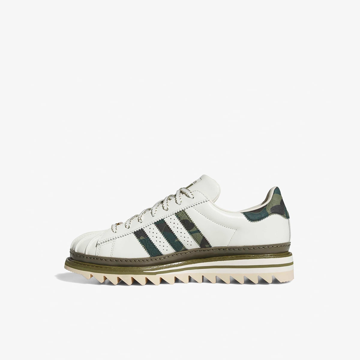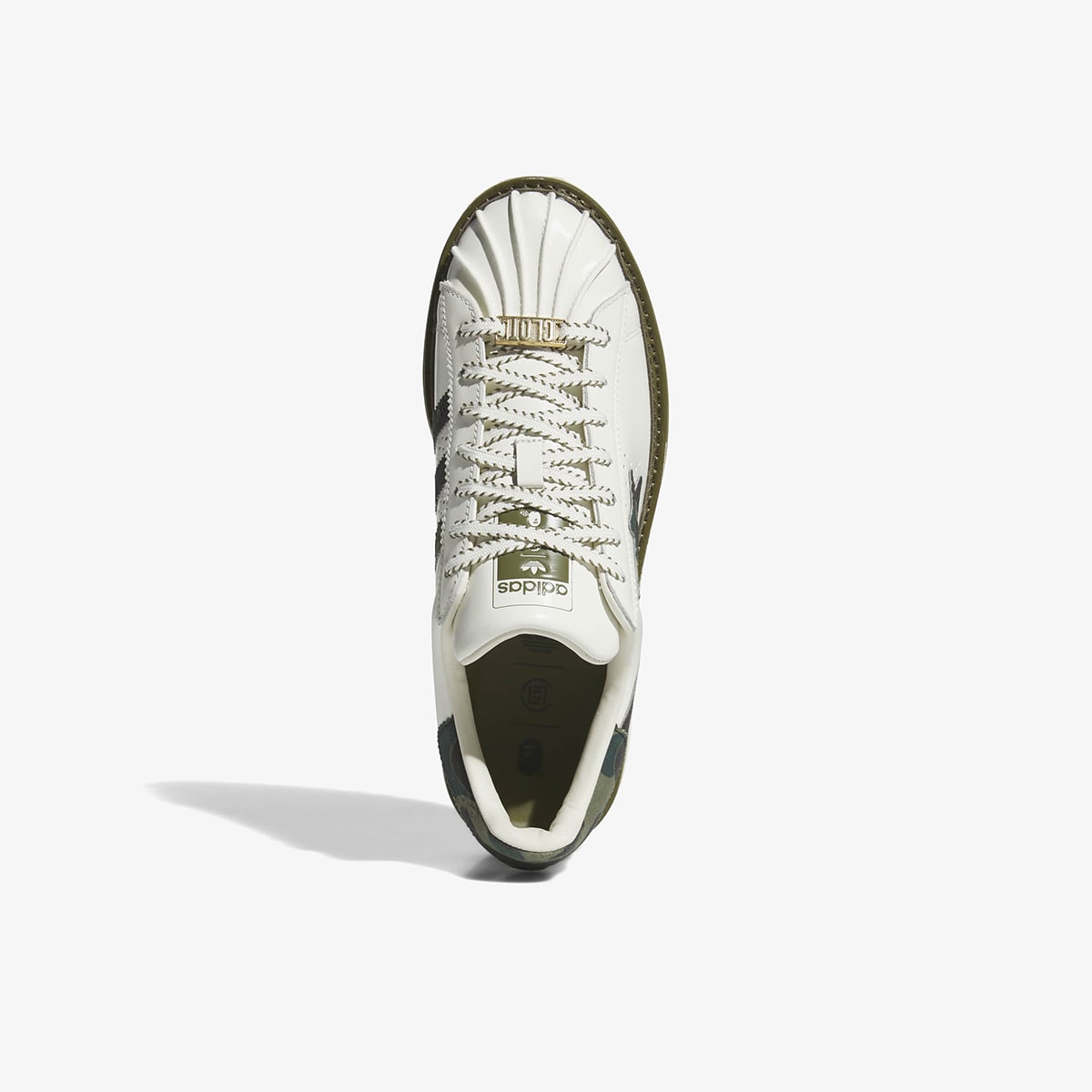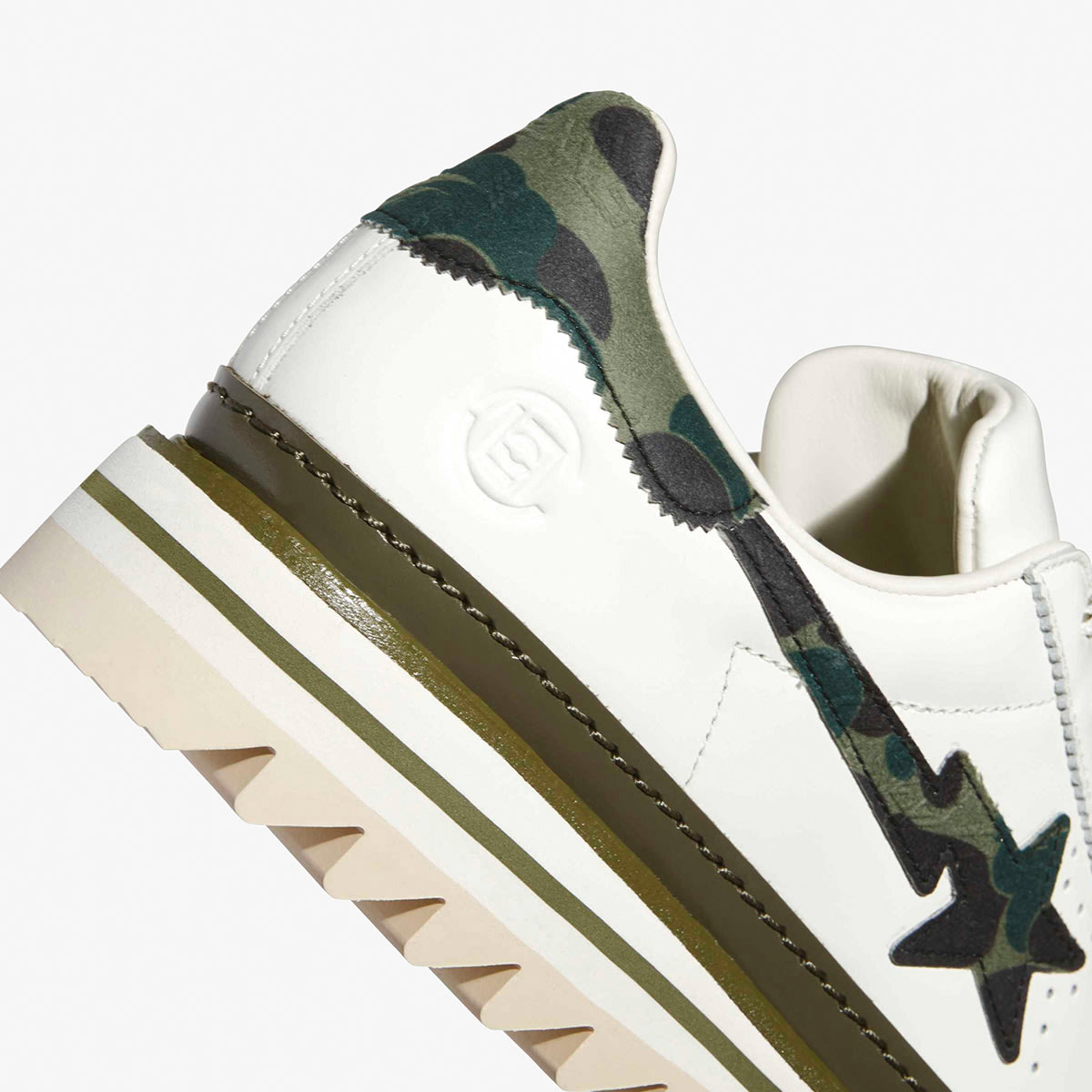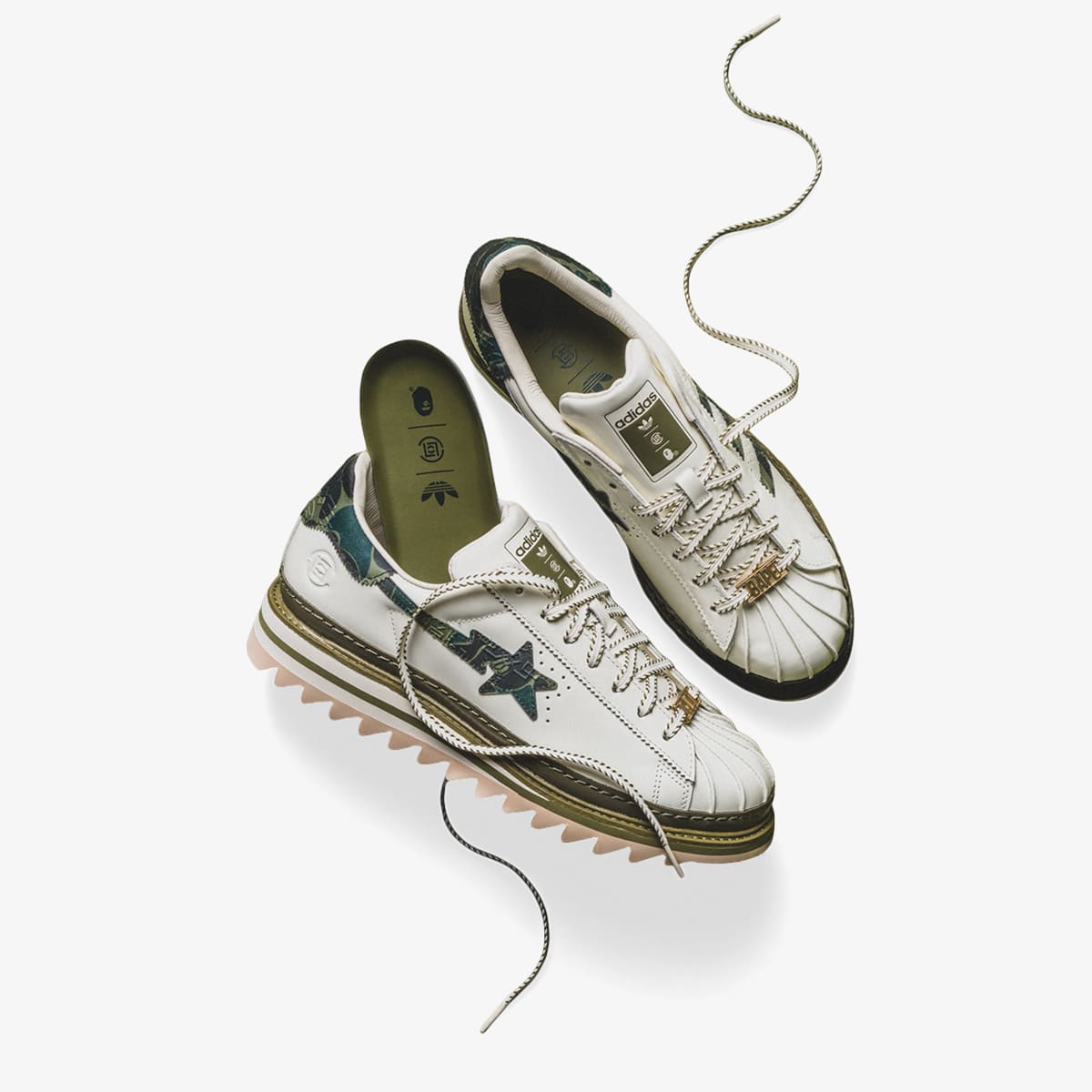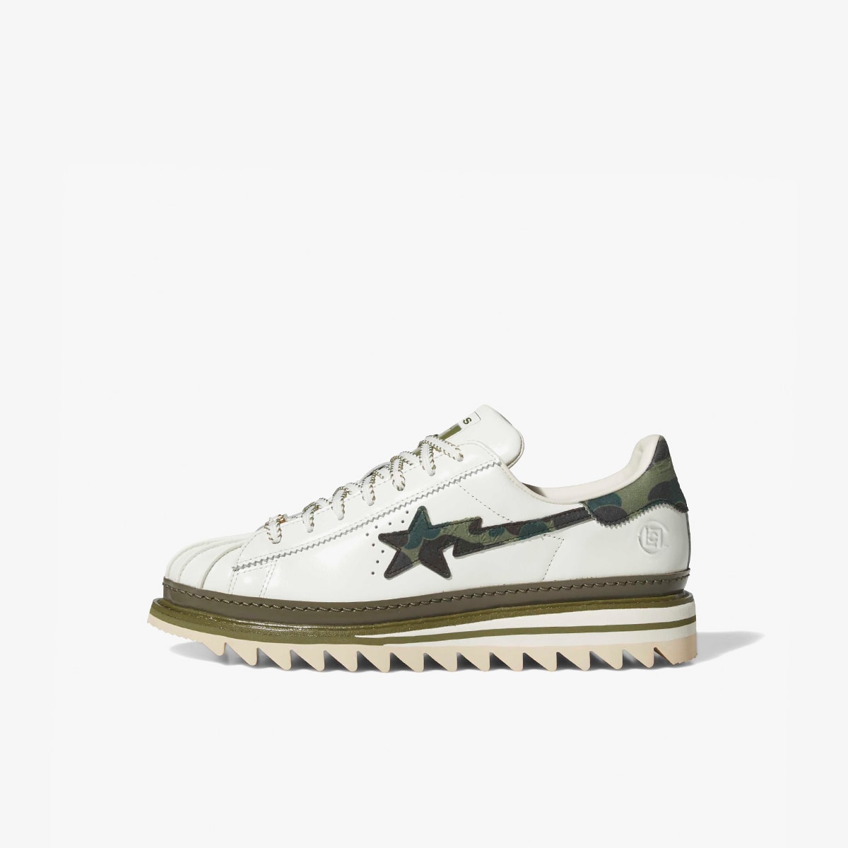 BAPE, the CLOT founder takes the iconic shell-toe into new territory. Off White, Branch, and Olive Cargo set the stage for BAPE camo STA logos, lace dubraes, and co-branded details, while a dress shoe-inspired sole mixes things up underfoot — showing Chen’s signature knack for reimagining the norm.