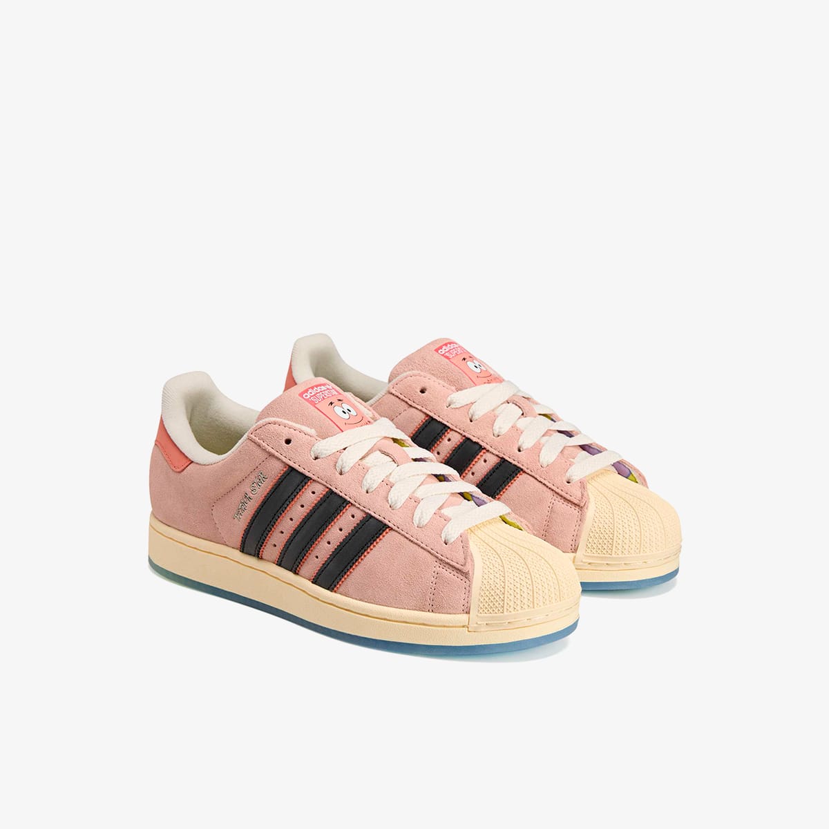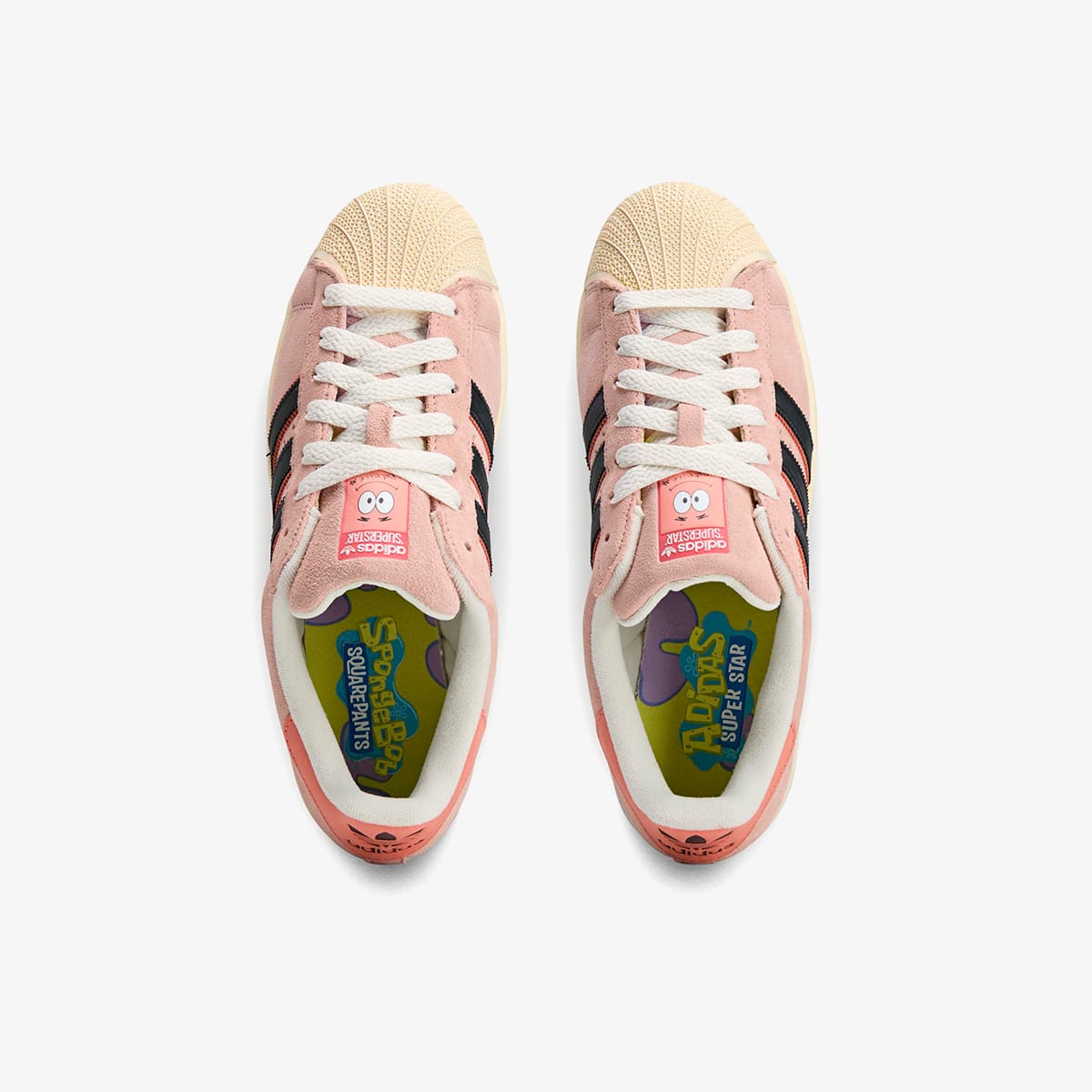 adidas heads to Bikini Bottom where the Superstar goes full Patrick Star. Inspired by SpongeBob’s best friend, this special-edition pair swaps classic white for soft pink suede, accented with black 3-Stripes and an off-white shell toe. A custom Patrick graphic hits the tongue, while a translucent blue outsole reveals underwater scenes from under the sea.
