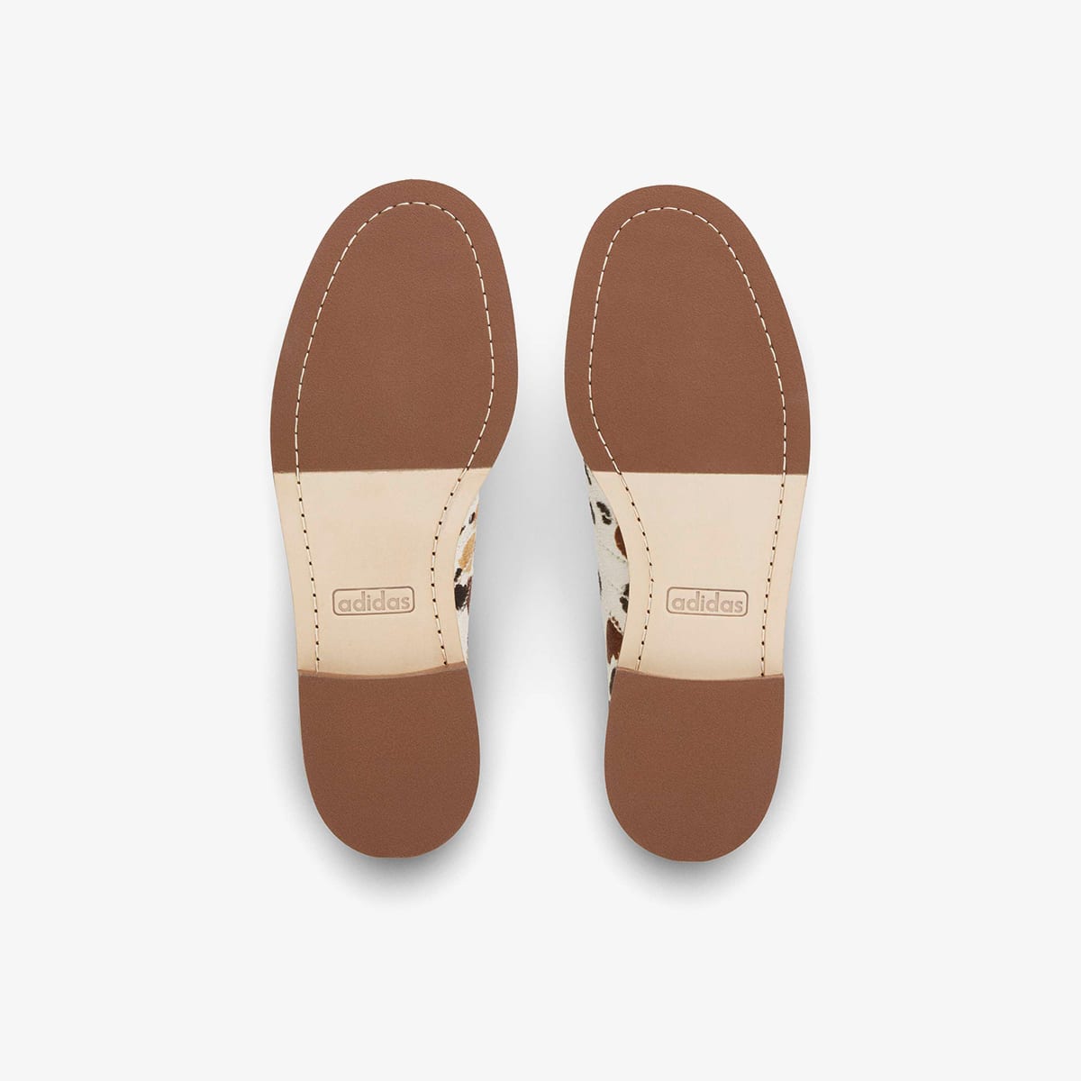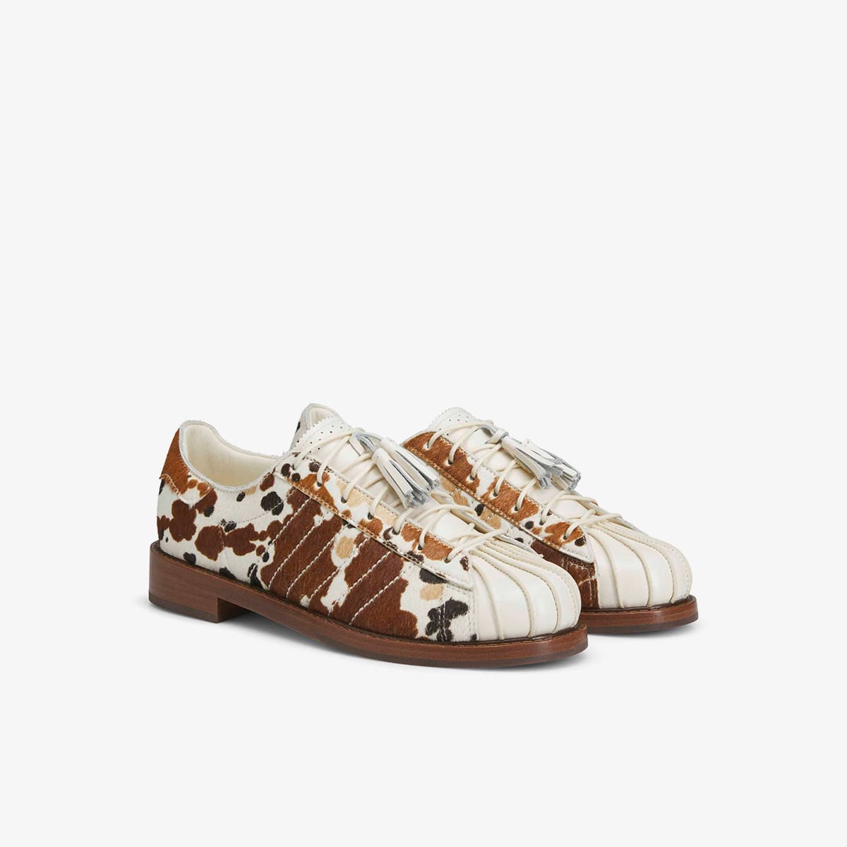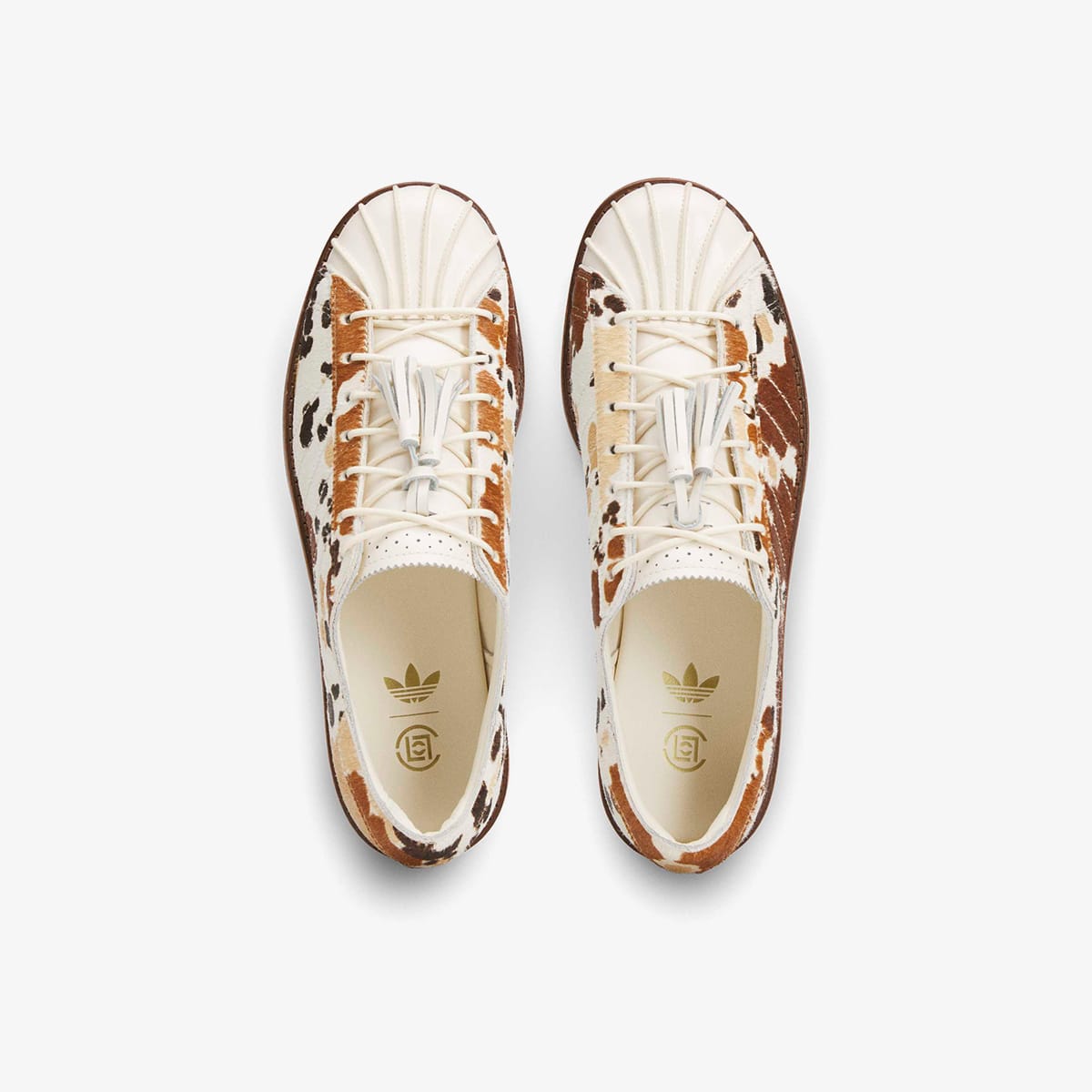 The adidas x CLOT Superstar dress sneaker reimagines a heritage icon through Edison Chen’s bold and contemporary lens. Anchored by the familiar shell toe, the silhouette pushes beyond its streetwear roots with a loafer-inspired stacked sole that shifts the Superstar into formal territory. Cream leather at the toe and tongue balances the textured faux cowhide upper, adding depth and striking style. Subtle stitched 3-Strpes keeps the branding refined, while tassel detailing nod to classic dress shoes. The result is a bold yet considered evolution of an adidas staple.