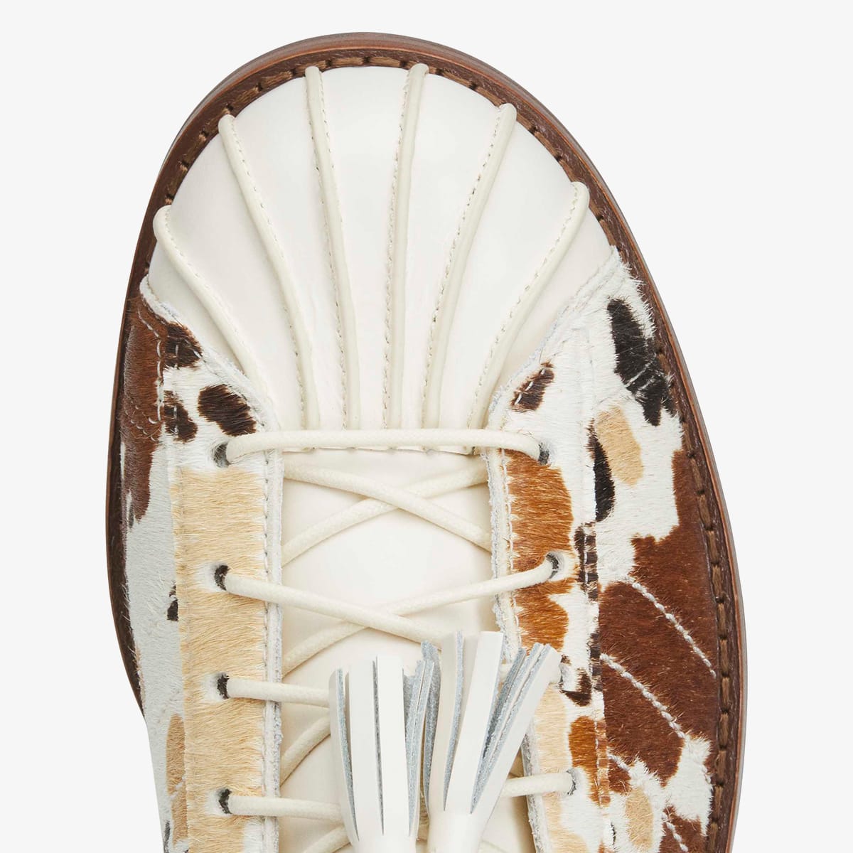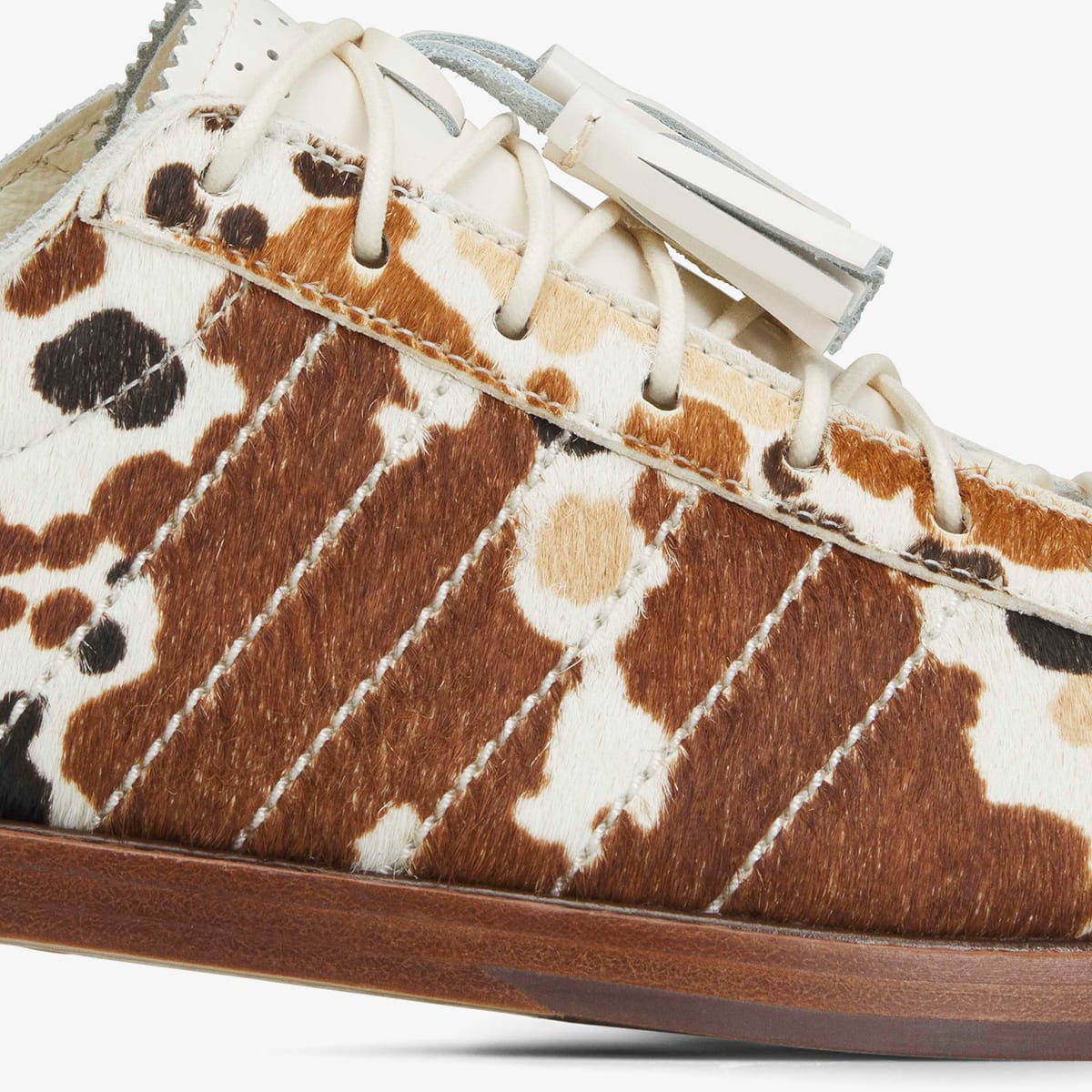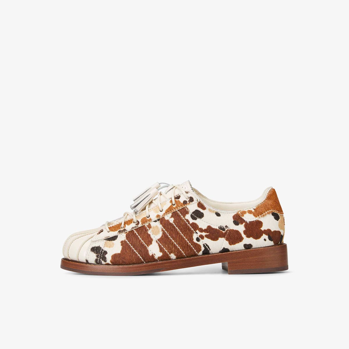 The adidas x CLOT Superstar dress sneaker reimagines a heritage icon through Edison Chen’s bold and contemporary lens. Anchored by the familiar shell toe, the silhouette pushes beyond its streetwear roots with a loafer-inspired stacked sole that shifts the Superstar into formal territory. Cream leather at the toe and tongue balances the textured faux cowhide upper, adding depth and striking style. Subtle stitched 3-Strpes keeps the branding refined, while tassel detailing nod to classic dress shoes. The result is a bold yet considered evolution of an adidas staple.