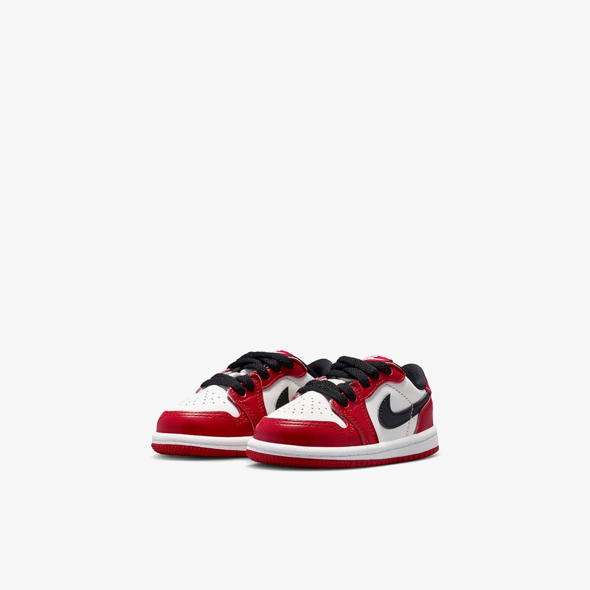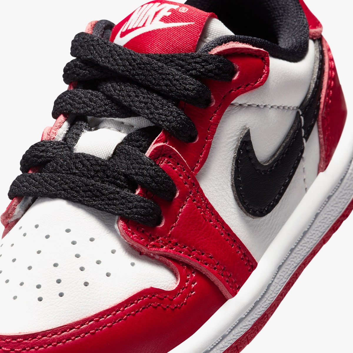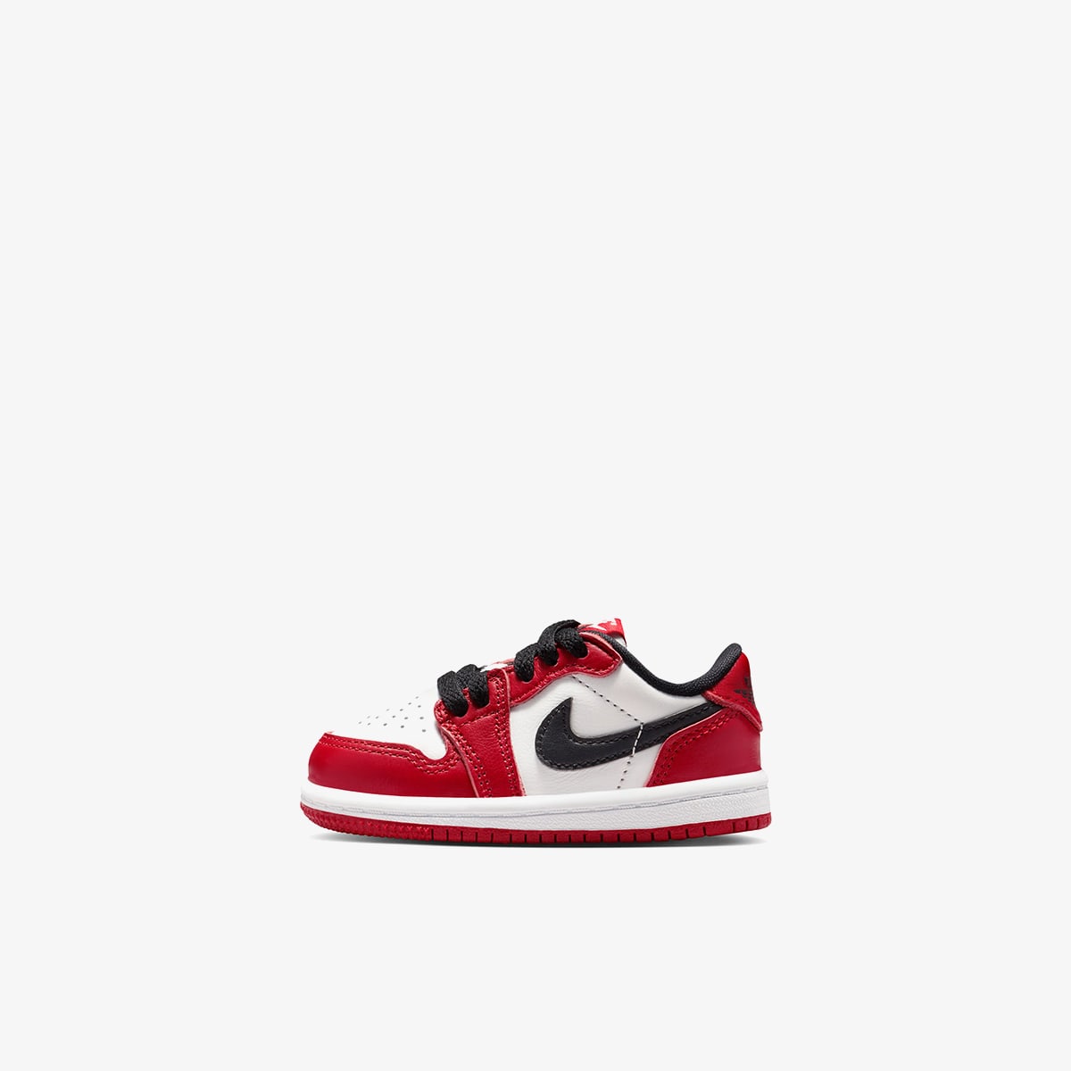 Air Jordan 1 Low OG’s take inspiration from Chicago Bulls jerseys. Made with white leather underlays and contrasting red overlays. black Swooshes on the sidewalls are larger than usual. Featuring signature perforations and Wings motifs, encapsulated Air in the rear provides comfort underfoot, before a durable rubber outsole rounds off the design.