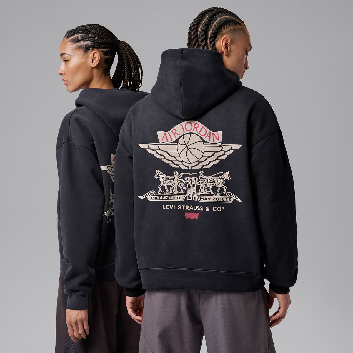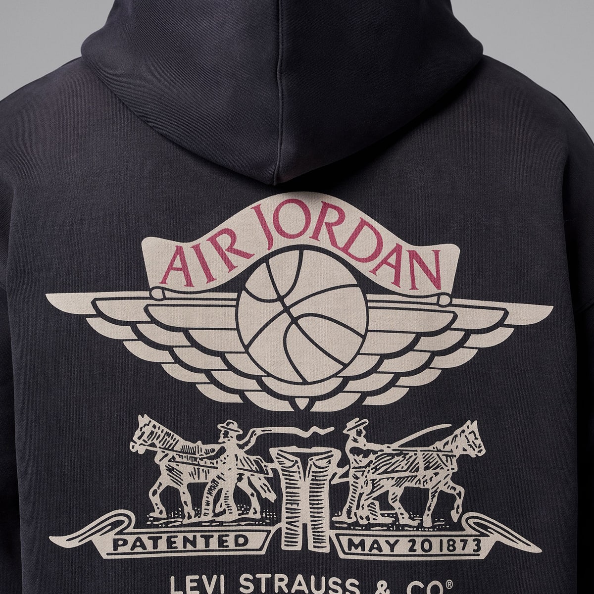The Air Jordan x Levi’s hoodie brings the collaboration’s boldest graphic language onto a heavyweight fleece base with a washed black finish. The back carries a collision of two icons — the Wings logo set above Levi’s Two Horse motif — creating a single graphic that feels unmistakably tied to both brands’ histories. The front stays pared back, letting the roomy hood, soft handle and easy fit do the talking. Ribbed trims keep the shape neat without losing that relaxed, throw‑on feel. It stands out because it carries both brands’ visual language in a way that feels lived, not loud.