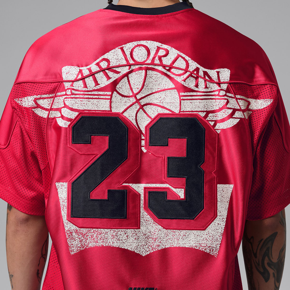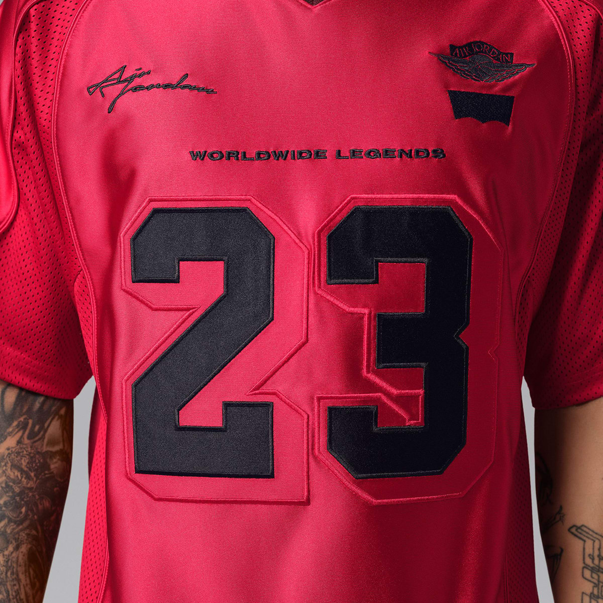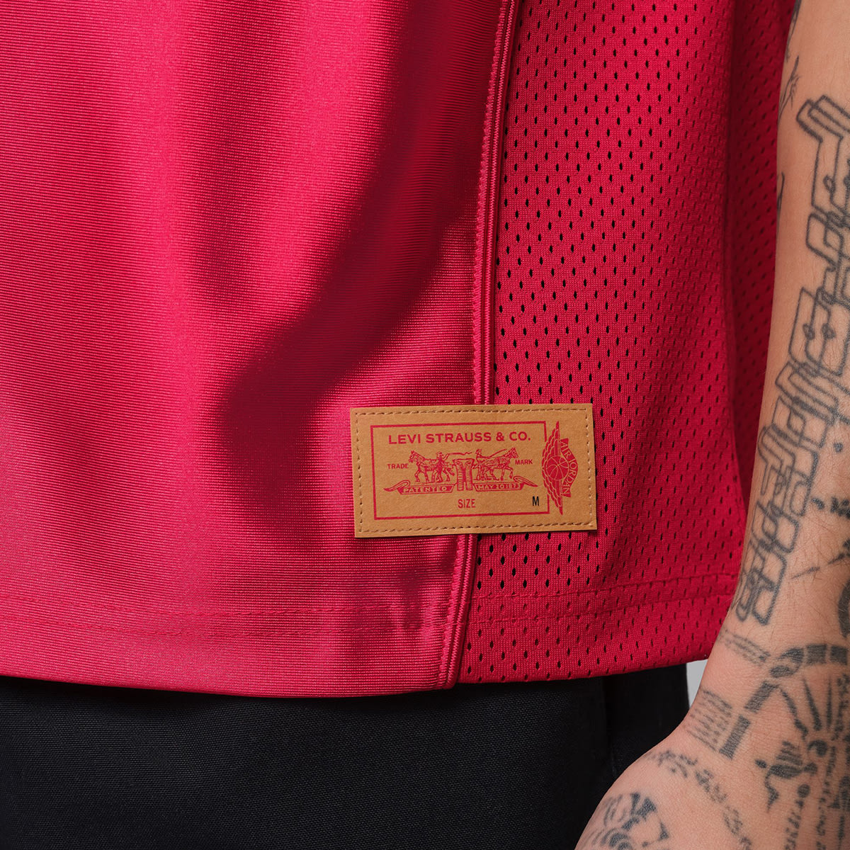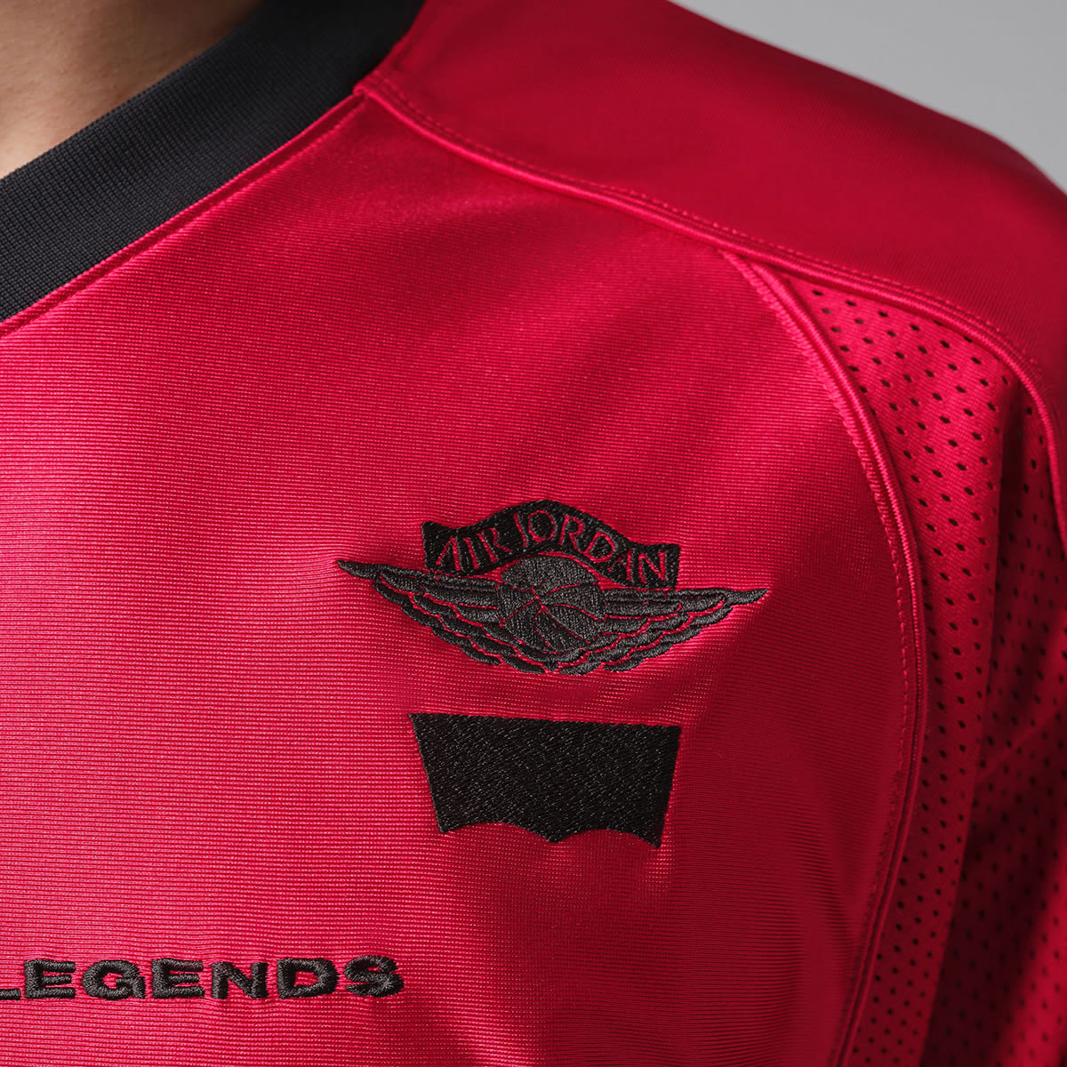 The Air Jordan x Levi’s jersey top takes a classic gridiron silhouette and reworks it with the collab’s sharpest graphic and material cues. Its boxy, cropped shape is cut from a mix of matte and gloss panels, giving the red base a subtle shift in tone as it moves. The front is loaded with embroidered hits — from the bold “Worldwide Legends” lettering to the stitched signature and shoulder patches — each one adding to the jersey’s lived‑in, collector feel. Flip it around and the oversized back graphic brings the Wings logo and the number 23 together in a way that feels unmistakably Jordan. A co‑branded jock tag at the hem ties it back to Levi’s sporting heritage, grounding the piece in the partnership’s shared sense of legacy.