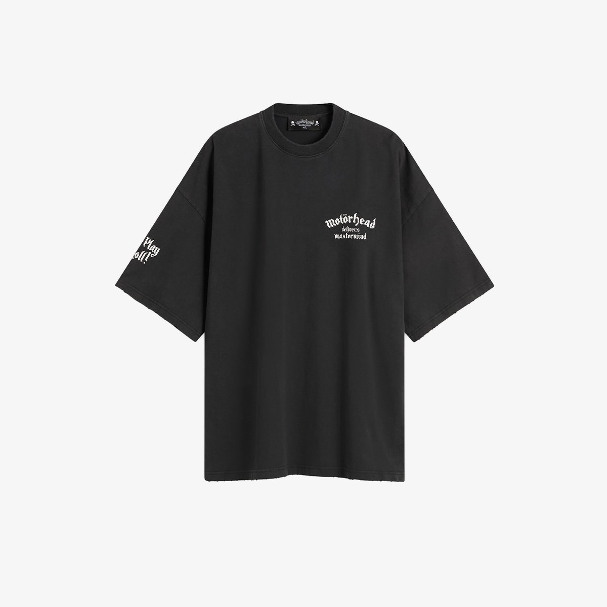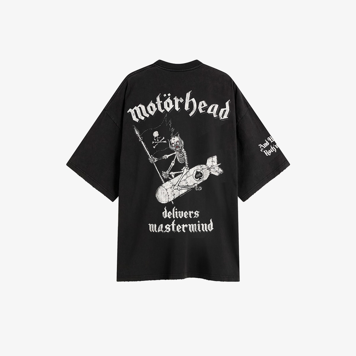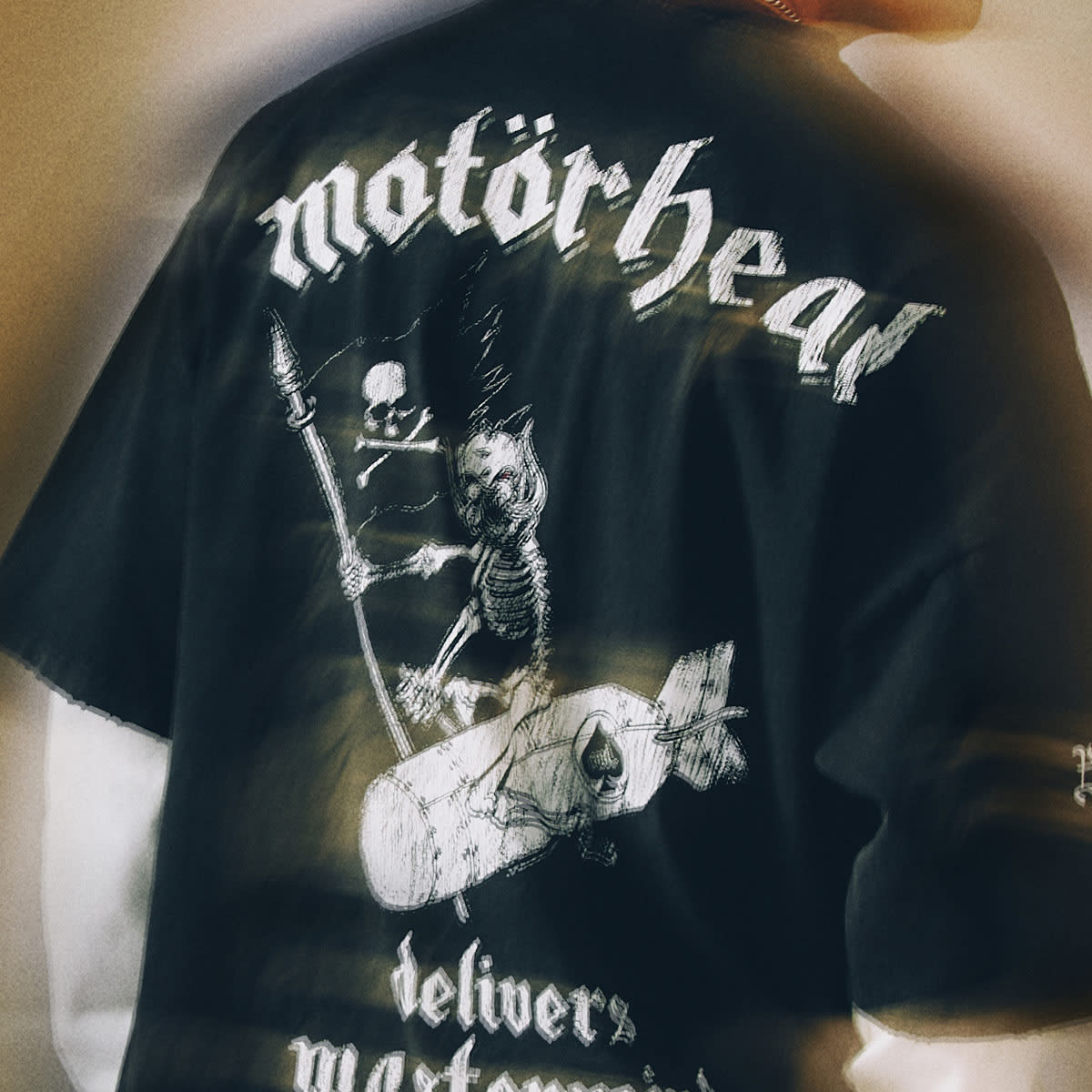 Taking over the entire garment, the Delivers tee is a maximalist celebration of Motörhead’s legacy. Distressed sleeve callouts declare “And We Play, Rock n Roll” alongside the Ace of Spades, while the chest features a collab logo in the band’s unmistakable font. The back graphic steals the show: Snaggle Tooth riding an END. missile, lifted from Motörhead’s 40th anniversary tour. Oversized, premium, and unapologetically loud, this tee embodies the tri-brand collaboration — END., MASTERMIND, and Motörhead — united in heritage and rebellion.