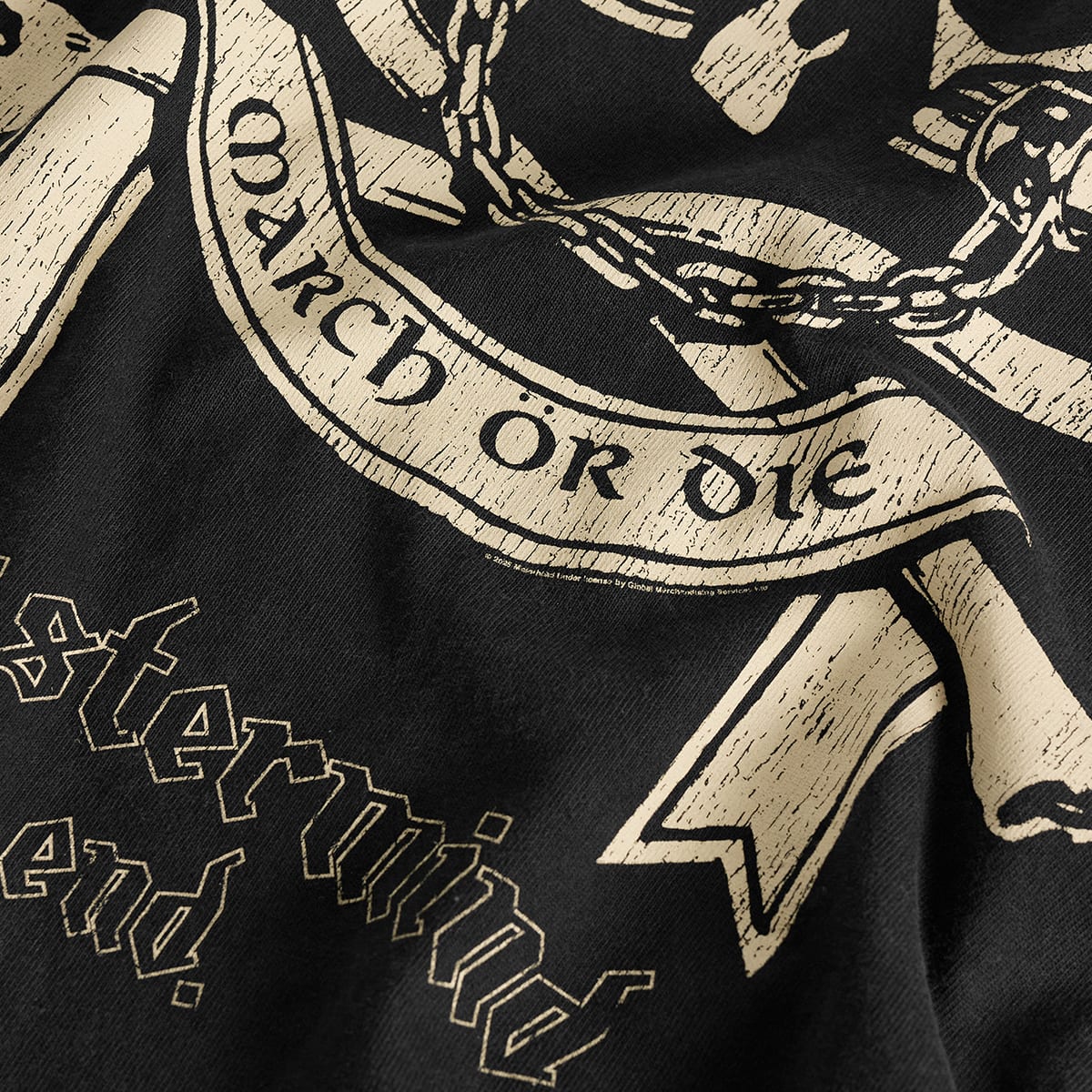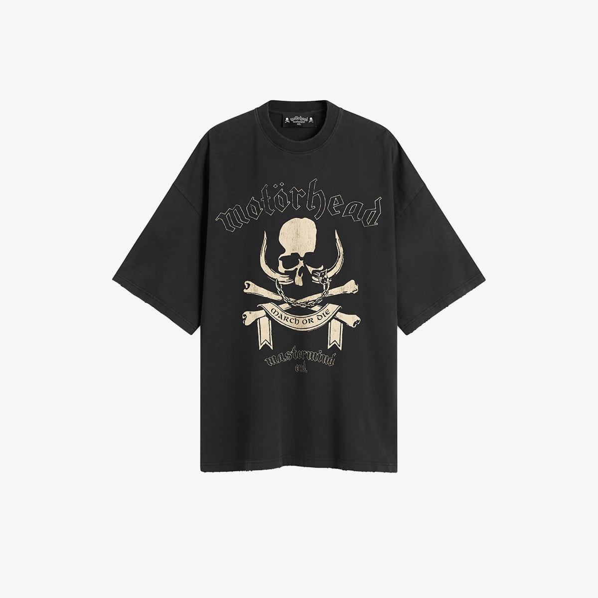 Pulled from Motörhead’s tenth album, the March or Die tee takes a stripped-back approach. A single off-white print sits against the acid-washed cotton, letting the garment’s distressed finish speak louder than words. Snaggle Tooth is replaced here by MASTERMIND’s skull, a stark reworking that nods to both brands’ uncompromising aesthetics. Oversized, premium, and steeped in heritage, this tee embodies the enduring spirit of Motörhead while marking END.’s milestone 20th anniversary.