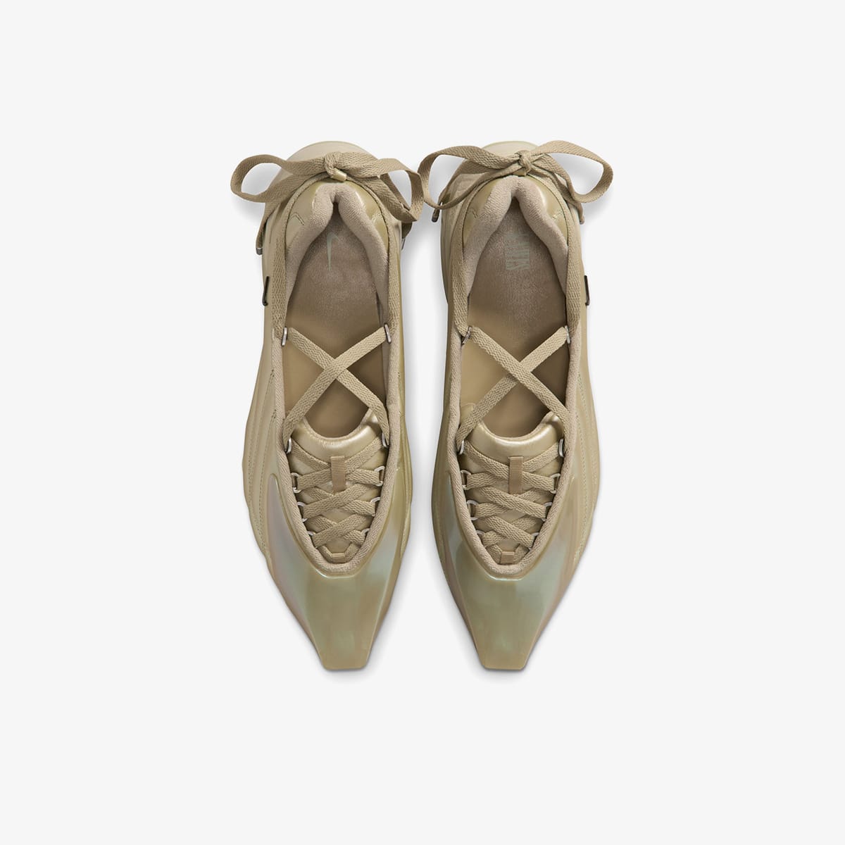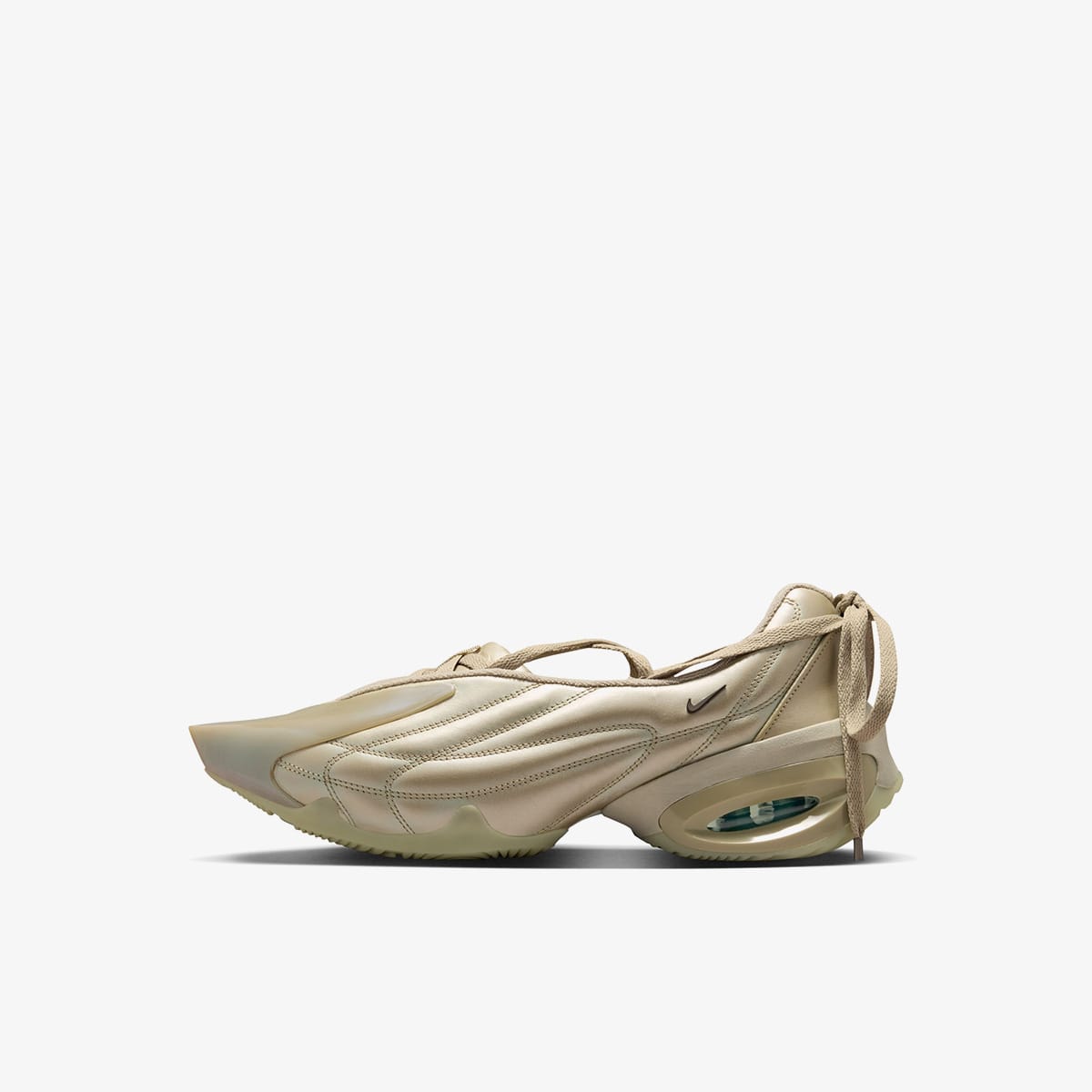 Nike joins forces with London-based label KNWLS to unveil the Air Max Muse Ballet – an avant-garde sneaker that fuses luxury with a ballet aesthetics. First revealed during Milan Fashion Week as part of KNWLS’s Spring/Summer ‘26 “Synergy” collection, the sculptural silhouette features a pointed toe, quilted black leather upper, and extended lace wraps reminiscent of ballet flats. Glossy TPU accents add contrast, while a mini Swoosh and co-branded details add subtle flair. Underfoot, the chunky heel houses exposed Max Air units for responsive support and cushioning. The Air Max Muse Ballet reimagines performance running through a fashion-forward lens, blending elegance and edge in one striking package.