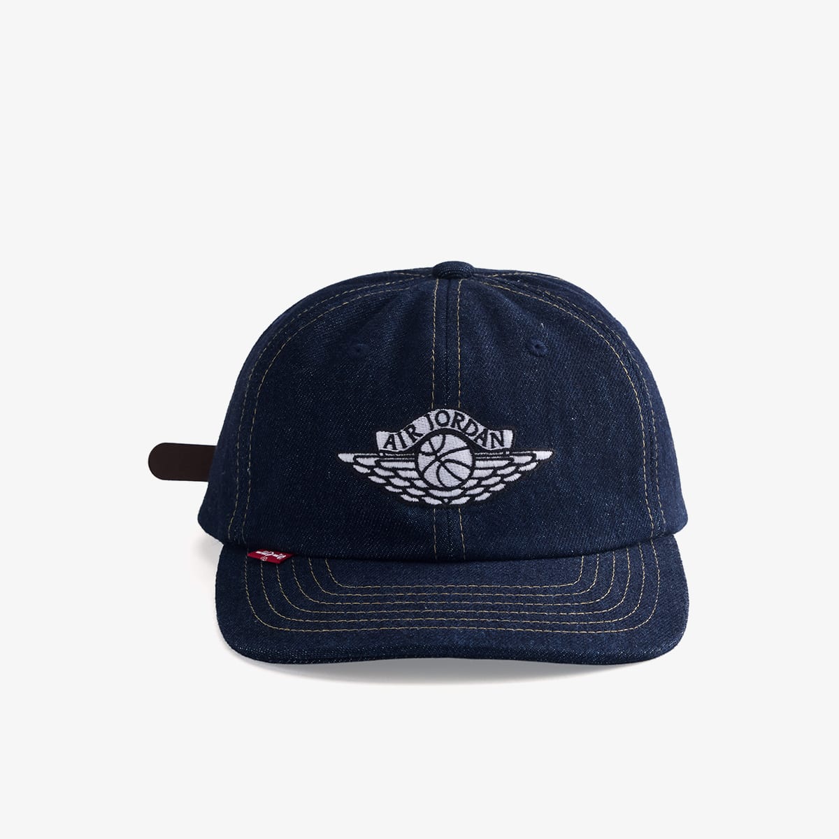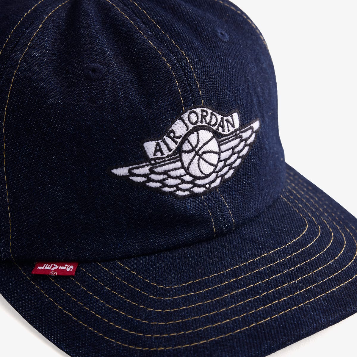 The Levi’s x Jordan denim cap distills the collaboration’s ethos into a single, wearable statement, blending Levi’s denim craftsmanship with Jordan’s unmistakable sporting iconography. Cut from rinsed indigo denim, the cap uses contrast stitching and structured panels to echo the collection’s focus on texture and construction. The embroidered Wings logo brings Jordan’s legacy to the forefront, balanced by a Levi’s Red Tab and Nike Air‑branded antique brass hardware that ground the piece in Levi’s heritage. A brown leather cinch at the back adds a premium touch, reinforcing the cap’s blend of utility and refinement. It’s an accessory that bridges subcultures the same way the collaboration does — understated, crafted, and rooted in everyday greatness.
