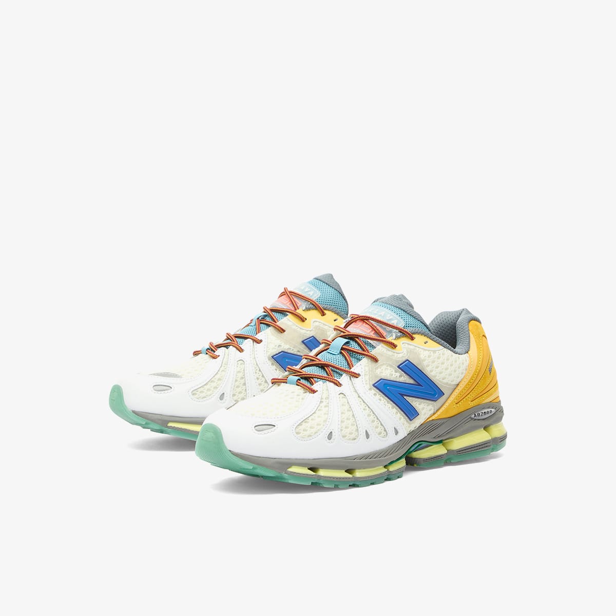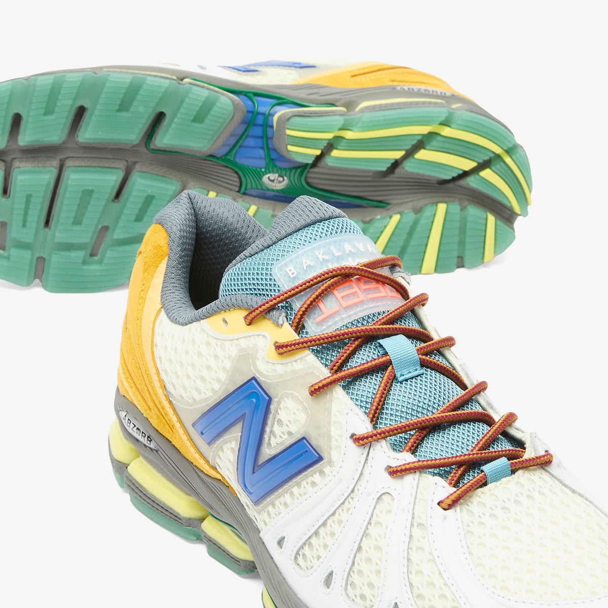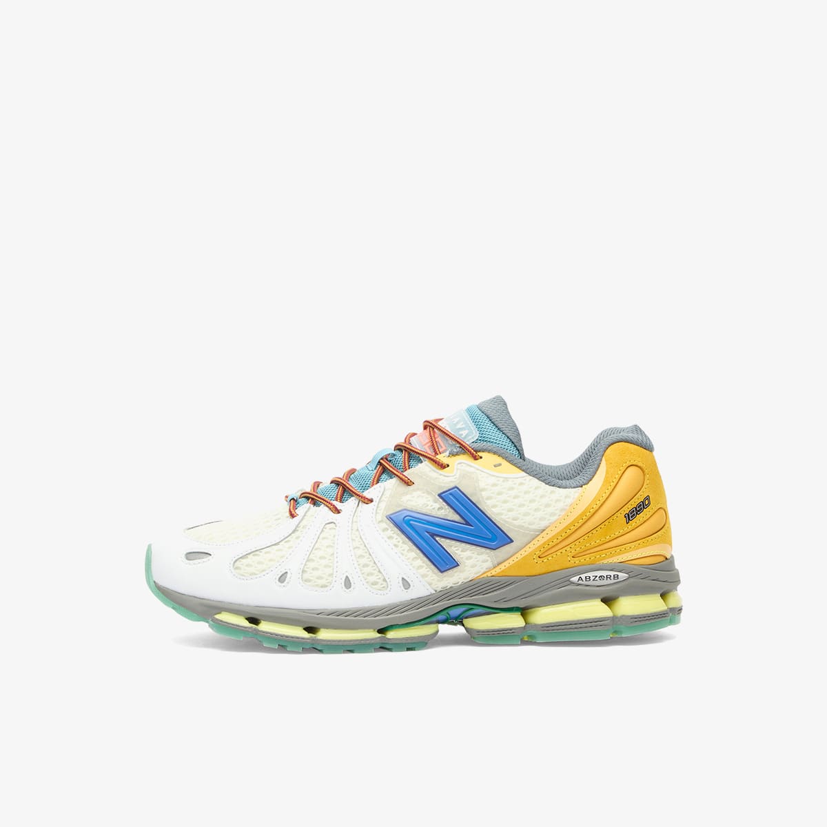 The New Balance x Action Bronson 1890 lands like a tech‑runner fever dream built straight from Bronson’s vision. It’s a brand‑new silhouette — layered with mixed materials, from open‑knit mesh to plush suede and sculpted leather panels. Striking overlays nod to NB’s mid‑2000s performance era, while a full‑length ABZORB sole with squared pods brings that chunky, propulsive feel. The "Hornet Tusk" palette goes full eccentric Baklava too: mint hits, neon pops, and warm orange accents, balanced by off‑white and grey grounding tones.