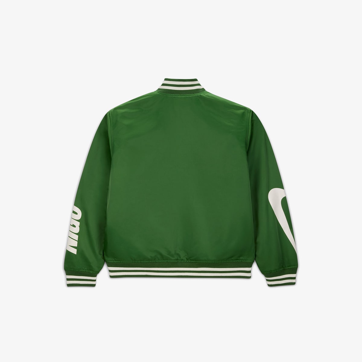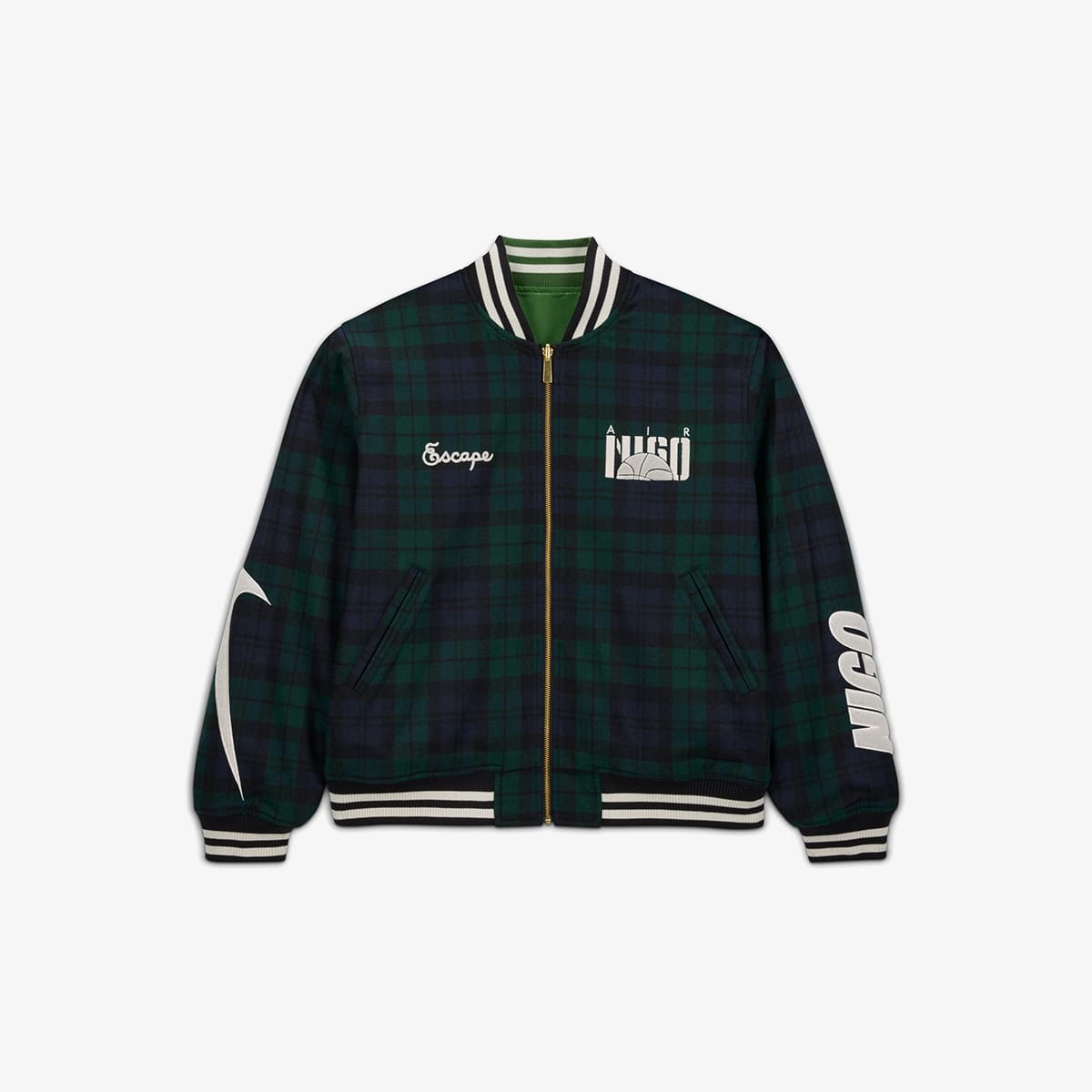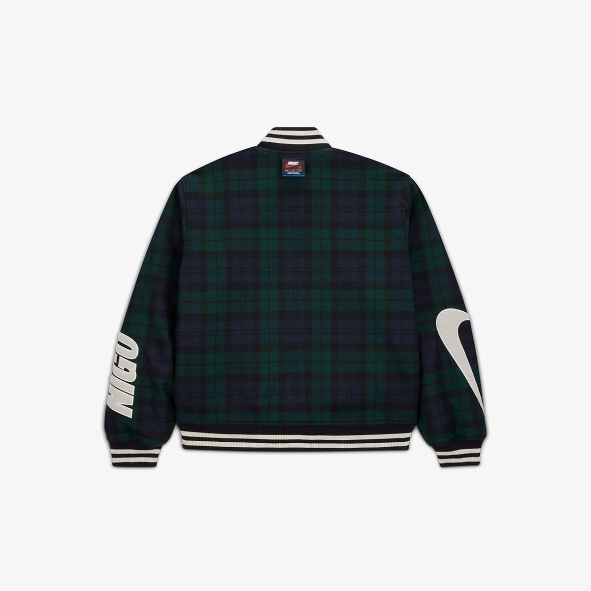 Nike links back up with Japanese style architect NIGO to craft a university narrative, turning to Pendleton's wool to rework a menswear classic: the Souvenir Jacket. This reversible piece lets texture do all the talking here - slick poly on one side, black watch tartan wool on the other, layered with boucle‑textured patches, crisp prints, and chain‑stitching that spotlight every collaborator behind the project. Flip to the tartan interior and a NIGO‑signed Swoosh label lifts to reveal the heritage Woollen Mill’s logo, quietly tucked at the nape.