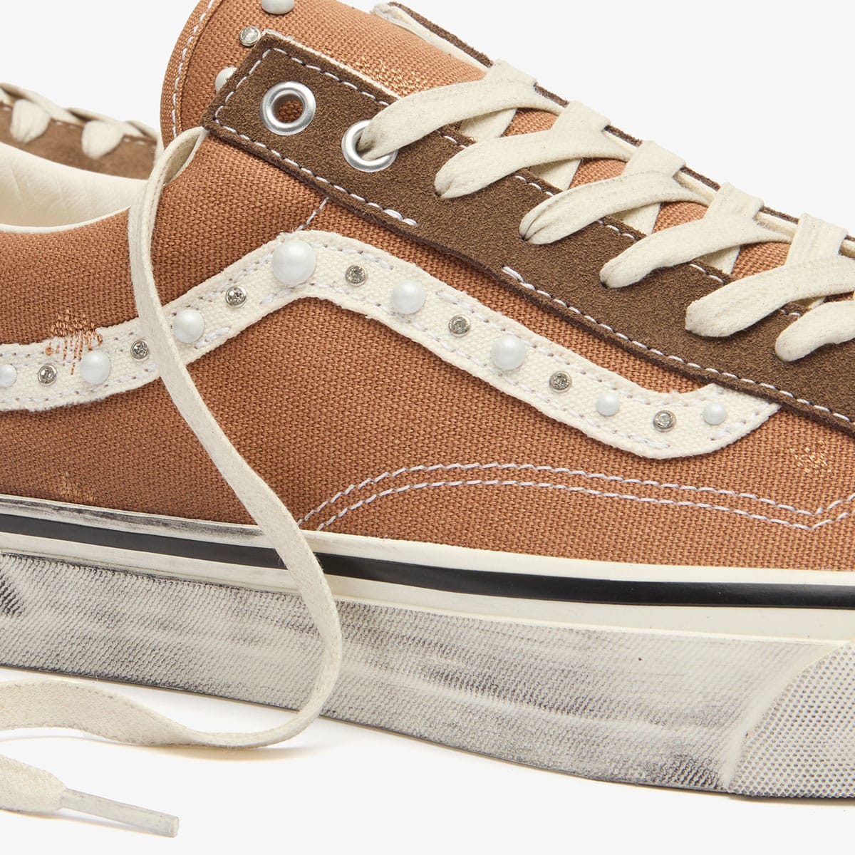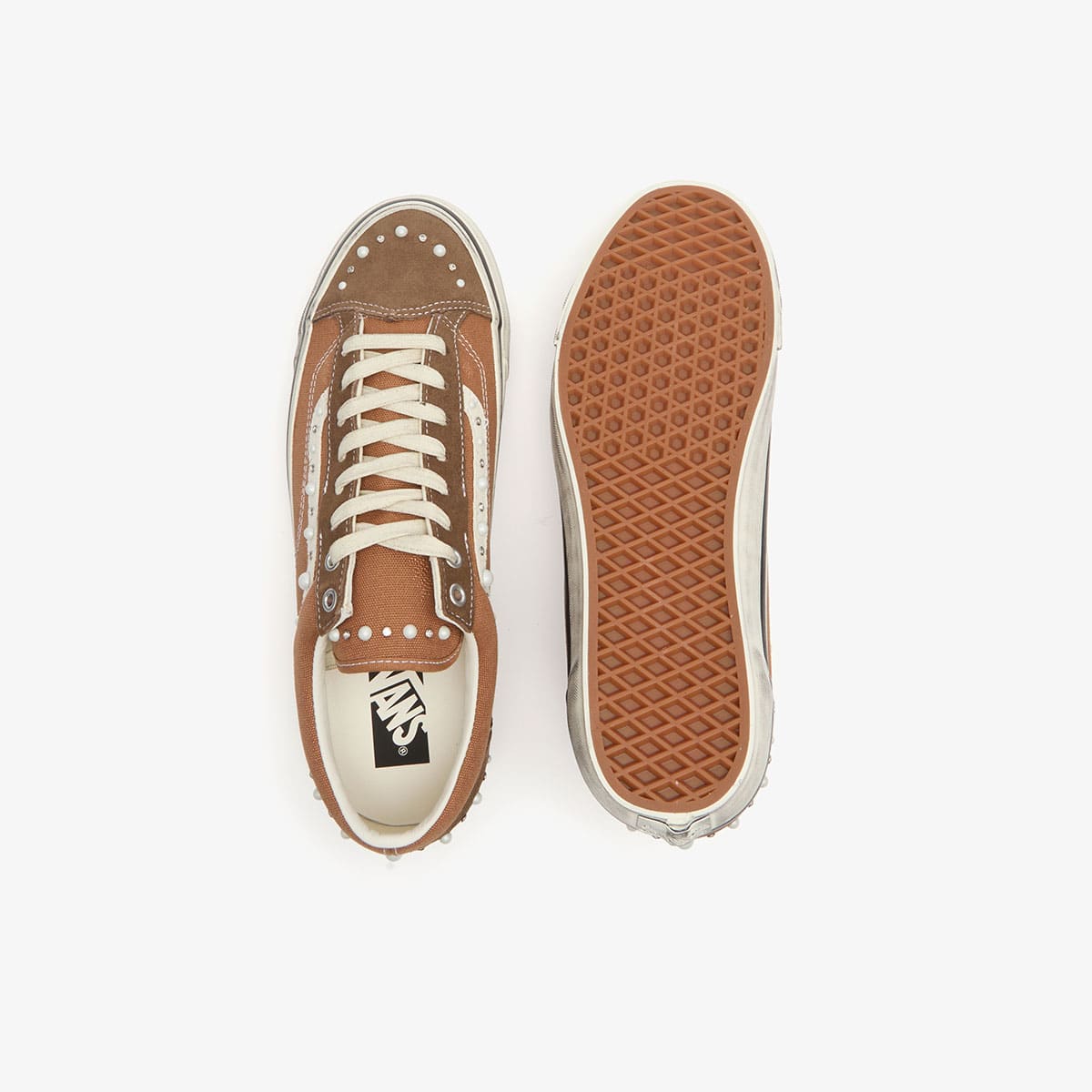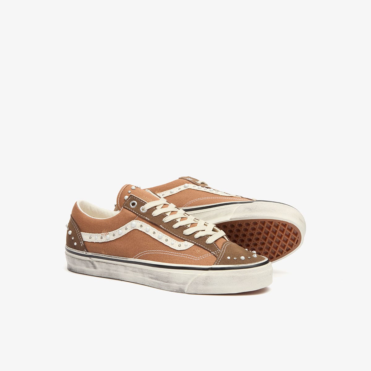The Vans Old Skool 36 proves once again why the classic never really leaves rotation. This season, this premium edition arrives in a rich Vintage Cocoa Brown, with pearlised embellishment and metallic and diamante studs tracing the signature side stripe for a subtle play on texture and light. The rest stays familiar to the OG, an off‑white rubber midsole, foxing tape inspired by the original 90's Osnaburg, and a vulcanised build that keeps the original look and feel firmly intact.